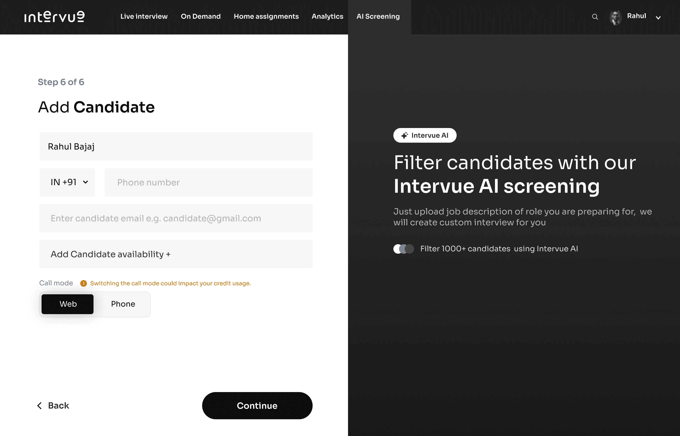 Intervue enables companies to outsource tech interviews to expert engineers, preserving their internal bandwidth. However, screening 2,000–3,000 candidates to identify the top 5% tech talent remains time-consuming. To streamline this, we introduced AI Agents to conduct initial screenings via web and call-based interviews.